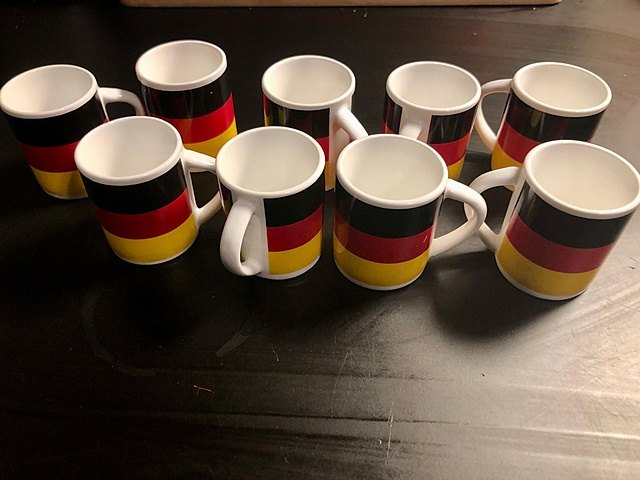 Der sagenhaft gut erhaltene und komplette Bestand einer Espresso-Tassen-Massenproduktion aus 1000 Berlin 27. Drei freiwillig bestimmte Zahntechniker formten vor ihrem Verschwinden aus einem keramikähnlichen Werkstoff im Jahr 1979 statt der selten genutzten Oben-Zahnprothesen für das Sommerfest der freiwilligen Feuerwehr Konradshöhe-Tegelort diese 9 Tässchen im zeitlosen Design.