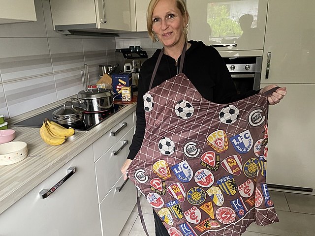 Eine kochfeste Alltagsschürze aus dem Fundus der Sparwasser-Achtlinge in der Einheitsbreigröße "m88". Kaum formstabil und klebt nur auf nackter Haut. Mit den lustigen Vereinsemblemen aller damaligen Ost-Vereine. Ein Unikat.
