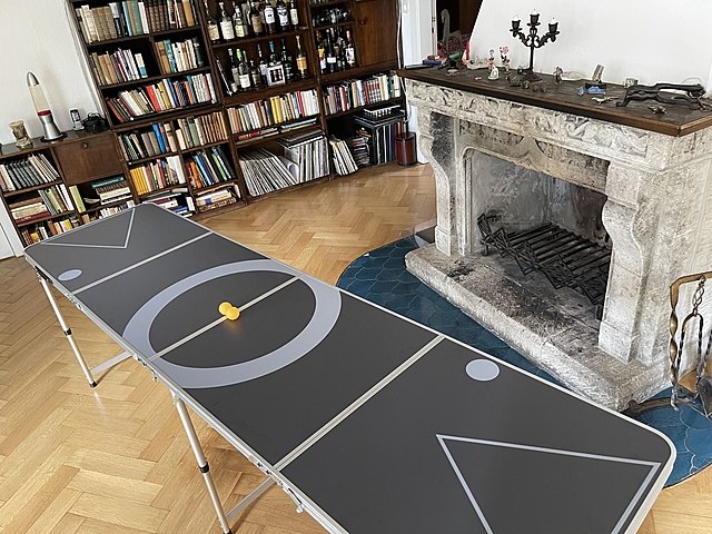 Auf diesen geilen, absolut neuwertigen Tisch werden so typisch rote Becher in einem Dreieck aufgestellt. Die werden mit Bier befüllt, und dann werfen alle Teilnehmer aus beiden Teams abwechselnd jeweils einen Tischtennisball in einen der Becher. Getroffene Becher werden vom generischen Team ausgesoffen, ihr wisst schon. Zusätzlich zum Tisch gibt's 50 Becher und 18 Tischtennisbälle.