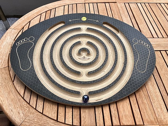 Das Labyrinth zu Füßen: Nicht jede Spur bringt die Kugel vom äußeren Kreis zum Inneren und zurück. Hier ist Balance und Koordination gefragt!