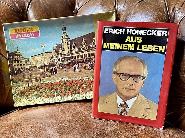 Für die ganz Harten verlosen wir Erich Honeckers Bettgeschichten mit Margot (Dietz Verlag Berlin, 6. Auflage von 1981 mit 98 Abbildungen, teilweise nackt) und dazu noch ein original Puzzle mit 1000 Teilen vom Leipziger Marktplatz (made in GDR). Die Ostalkicker kommen diesmal wirklich auf ihre Kosten.