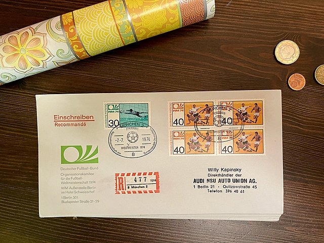 Was für ein Fund auf dem Flohmarkt im Mauerpark: 25 Umschläge mit je 30- und 40 Pfennig-Briefmarken drauf, entwertet mit dem Sonderstempel "München 2 Weltmeister" zur WM '74, bei der wir ja bekanntlich den zweiten Stern geholt haben. Absolut neuwertig. Was Willy Kapinsky mit der ganzen Sache zu tun hat, ist ungeklärt. Auch ob und wie sich das auf den Wert dieser exklusiven Edition auswirkt.